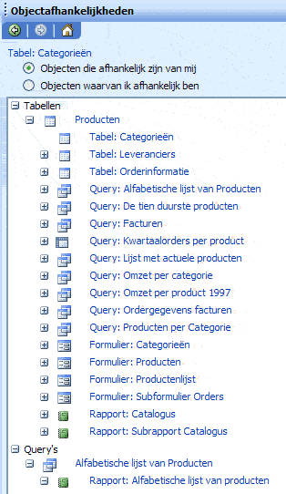 Dit nieuwe taakvenster geeft de afhankelijk-heden tussen de objecten
